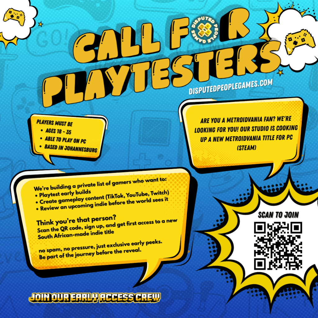 Are you a Metroidvania fan? We’re looking for you! Our studio is cooking up a new Metroidvania for PC (Steam), and we would love to have playtesters between the ages of 18-35 who are based in Johannesburg. Before we plate out anything publicly, we are putting together a private early-access list of gamers who are interested in: – Playtesting Early builds and giving feedback, creating gameplay footage while playing the game (TikTok, YouTube, Twitch, etc), reviewing it as an indie gamer/ press. No spam, no pressure – just early access to a South African-made indie when it’s ready. Scan the QR code to join.